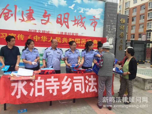 为全面贯彻落实中央、省、市决策部署,让《民法典》走到群众身边、走进群众心里,2020年8月12日,大同市平城区水泊寺司法所在马家堡村恒祥园小区开展了《民法典》学习宣传活动。水泊寺司法所武新华所长、山西向吉律师事务所张纲举主任以及司法所相关工作人员参与了此次活动。