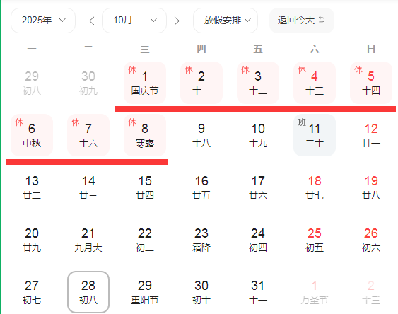放假时间:10月1日(星期三)至10月8日(星期一)放假,共8天。10月11日(星期六)正常上班。放假期间,各部门要切实做好应急值班和安全、保卫等工作,遇有重大突发事件发生,要快速反应、妥善处置,并及时报告,确保人民群众欢乐祥和度过节日假期。