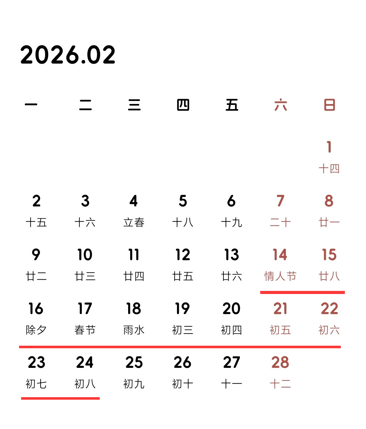 春节假期:2月14日(腊月二十七)至2月24日(正月初八)放假调休,共11天。2月25日(正月初九)正常上班。